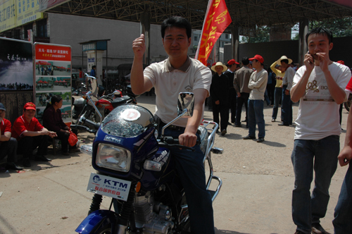 另一位来自黄花镇的曹先生,当天是一家人都到现场,在试骑了天马超逸SF装置摩托车后,立即决定把现场的一辆样车买下。由于当地天马专卖店的黄花欣盛车行还没来得及定此车的零售价格,弄得经销商谭老板都不知如何是好,在经过咨询在现场的天马总公司领导后,谭老板决定以优惠价把第一辆样车卖给曹先生。