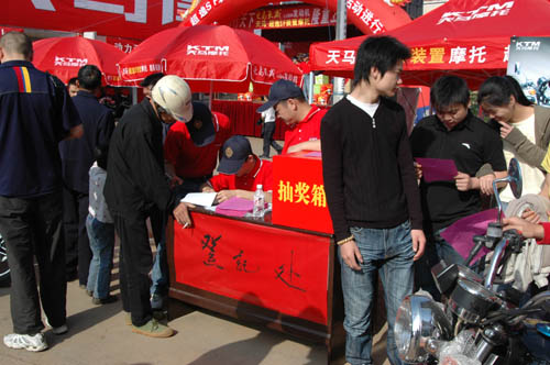 从上午9点开始,天马·超逸SF装置摩托试乘试驾活动就在有序的进行。笔者在现场看到,试乘试驾活动非常壮观,现场维持秩序、为试骑车加油、现场引导等工作人员就有10多人;专门设置了5名专业的骑手,每人固定负责一辆天马·超逸SF装置摩托车,并负责该车全过程的安全;现场还设置了记录员2人、礼品发放员2人,专职记录下试乘试驾天马超逸SF装置摩托的客户感受和发送礼品,参与试乘试驾天马·超逸SF装置摩托车的每个人都有礼品赠送。