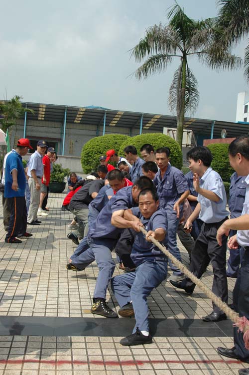 拔河比赛决赛是上午的压轴,虽然时间已是接近11点,烈日当空,现场人员汗流浃背,但并没丝毫影响到运动员、工作人员、啦啦队的热情。拔河比赛进行的是三四名(对阵双方分别是摩托车间一队对物资供应)和冠亚军的争夺(对阵双方分别是动力二队对动力三队),采取三场两胜制决胜负。比赛开始,哨声一响,双方队员就进入力量的比拼,双方的啦啦队更是卖力呐喊,为队员加油助威。
