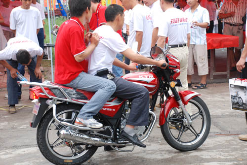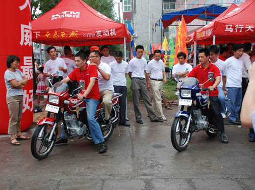 7月1日,恰逢中国共产党87周年生日,一大早全体人员乘坐大巴车来到活动基地——河南省延津县天马摩托车专卖店。延津专卖店田启山总经理早已准备好了歌舞表演和现场抽大奖的活动。由于事先通知了天马摩托车的老用户,现场前来参加活动的观众将专卖店门前堵得水泄不通,一些经老用户推荐前来选购天马摩托的消费者更是充满了期待的眼神。在天马摩托车用户当中,笔者看到了很多“历史已久”的老天马的身影,它们当中既有TM100-3、精通天马TM100-18的弯梁款,也有精通天马TM125、TM125-4的骑士款等等。其中,来自延津县马庄镇的王姓用户的那辆TM100-3弯梁车最能吸引人的目光,据王姓消费者介绍,他的TM100-3已经骑了8年的时间,虽然经风历雨,车的外表已经很破旧,有些地方的塑件甚至残破不全,但这丝毫不妨碍他正常使用。“我们乡镇的消费者买摩托车最讲究实用,相对来说,摩托车对我们来说也属于大件消费品,只要发动机耐用,外表再怎么也不丢份。天马车给我的感觉就是这样,别看它现在的外表有点难看,但是发动机超好,行驶在路上根本听不见太大的噪声,而且加速特别快,动力丝毫不亚于新车。当然,我也承认这里边也有维护使用的好的因素,但说到头,也是厂家和经销商服务的好,我的维护离不开他们的帮助。前几天,田老板给我打电话说今天要搞活动,我就从18公里远的马庄镇过来了,过来也倒不是说非得抽个奖或要点什么礼品的事情,就算是捧捧场,向那些要买车的消费者显摆显摆吧。再就是,我这车虽然还很好用,但过来看看天马的新车型,也是考虑要换车了,提前先感受一下吧。”面对围观的消费者,王姓用户对自己的“破玩意”一点都不为难情,实实在在的话语也丝毫没有替厂家做宣传的噱头。