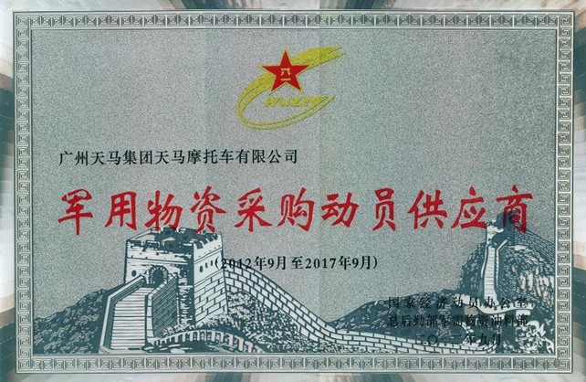 军用物资采购应商是军队物资采购的后备力量,承担军队物资应急采购任务,是军队保障社会化的重要内容。入选广州市第一批军用物资采购应商,再次表明天马摩托综合实力及产品质量得到了军队的认可。