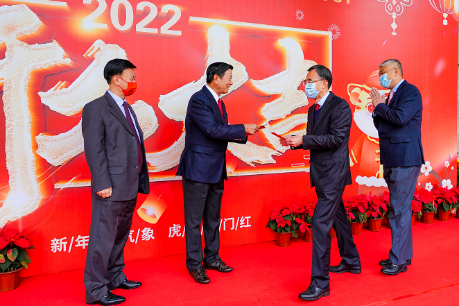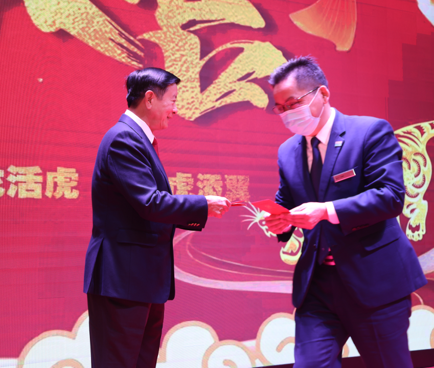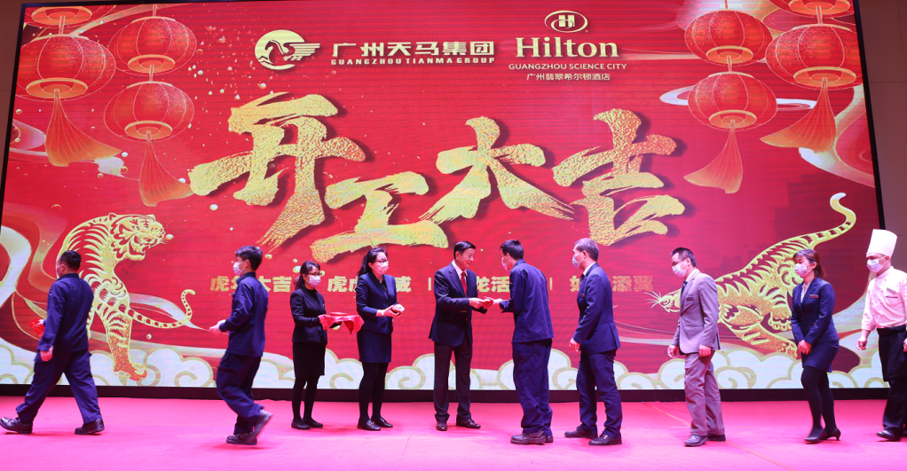 2022农历新年大年十五,集团董事长刘维嘉先生带领集团领导班子到旗下广州翡翠希尔顿酒店,向全体员工拜年,并派发开工利是。董事长勉励酒店全体员工要同心戮力,克服疫情影响,迎难而上,争创佳绩!